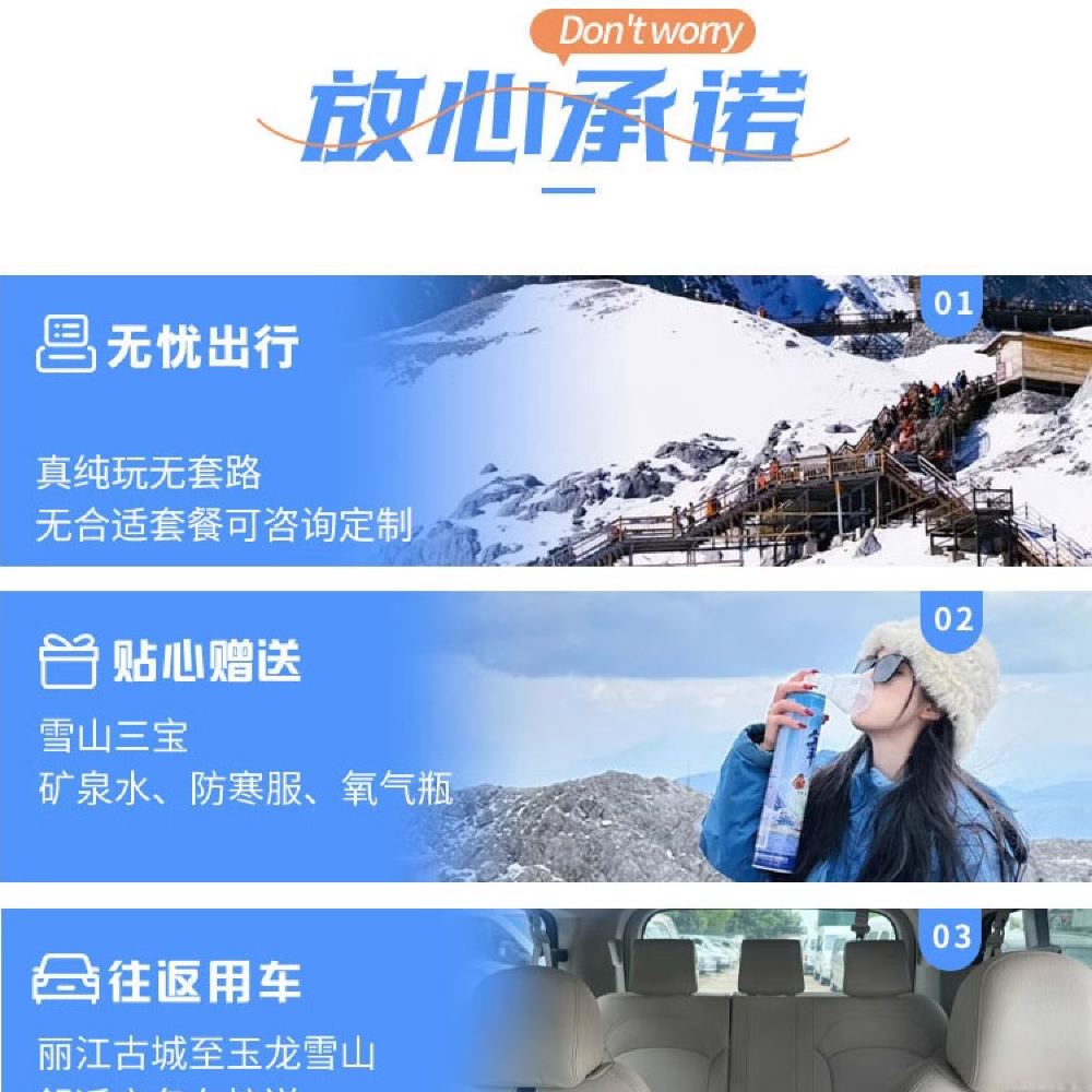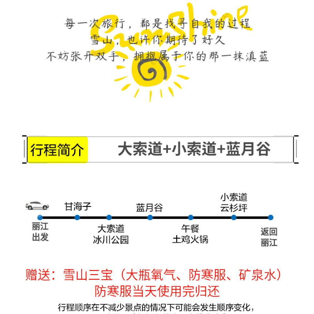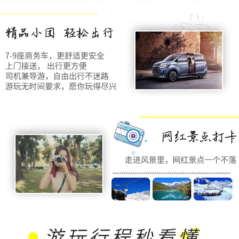 一、特别提醒:玉龙雪山索道票实行分流分段制,我们会根据索道票时间调整游览顺序,索道时间以系统审核为准确,人为无法指定时间 。统一安排6~8人小团,车辆随机安排,敬请谅解!!