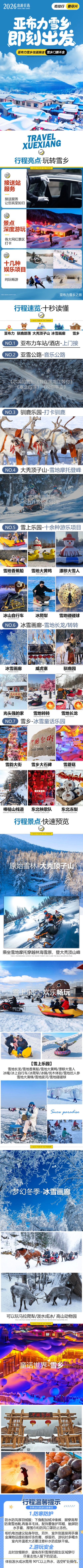 包含:亚布力往返雪乡免费接送+驯鹿部落门票(60元)+大秃顶子山(雪地摩托门票280元)+冰雪画廊门票(180元)+赠送:戏雪乐园(雪地长龙+雪地转转80元/人)