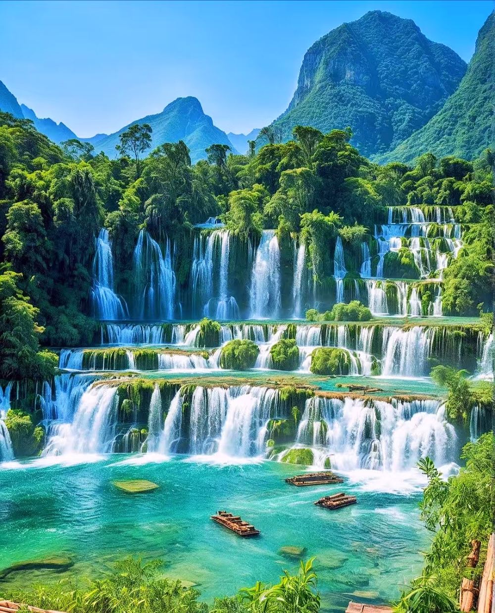 位于广西壮族自治区崇左市大新县硕龙镇德天村,中国与越南边境处的归春河上游。瀑布气势磅礴、蔚为壮观,与紧邻的越南板约瀑布("Bản Giốc & Đức Thiên")相连,是亚洲第一、世界第四大跨国瀑布,年均水流量约为贵州黄果树瀑布的三倍,为中国国家AAAAA级旅游景区。 还是《酒是故乡醇》和《花千骨》的外景拍摄地,神奇而美妙。徒步进入景区游览亚洲第一大、世界第四大跨国瀑布,瀑布由【中国德天瀑布】和【越南板约瀑布】相连构成,横跨中越两国边境,宽208米,落差70米,纵深60米,三级跌落,雄奇壮阔!