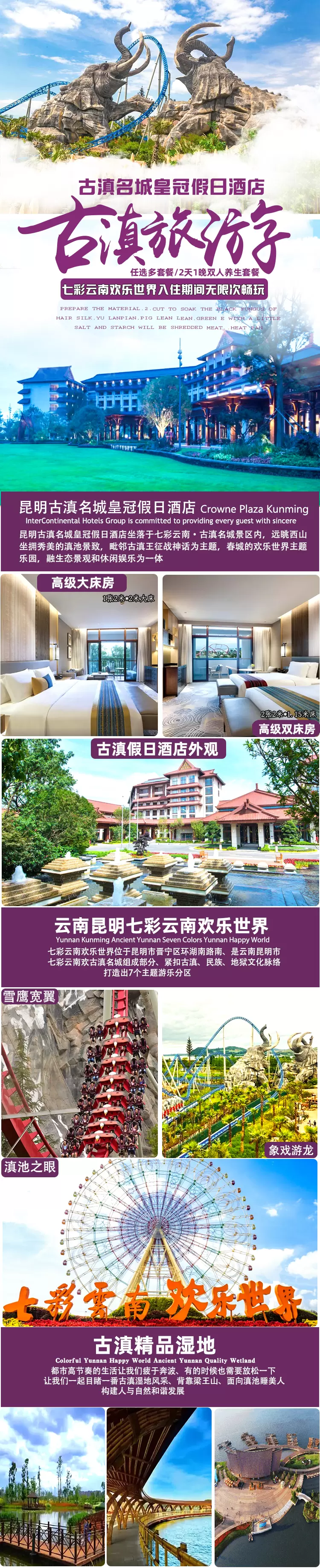 【酒店套餐】昆明滇池(古滇)皇冠假日酒店1晚+2日七彩云南欢乐世界无限次入园门票2张+酒店早餐2人
