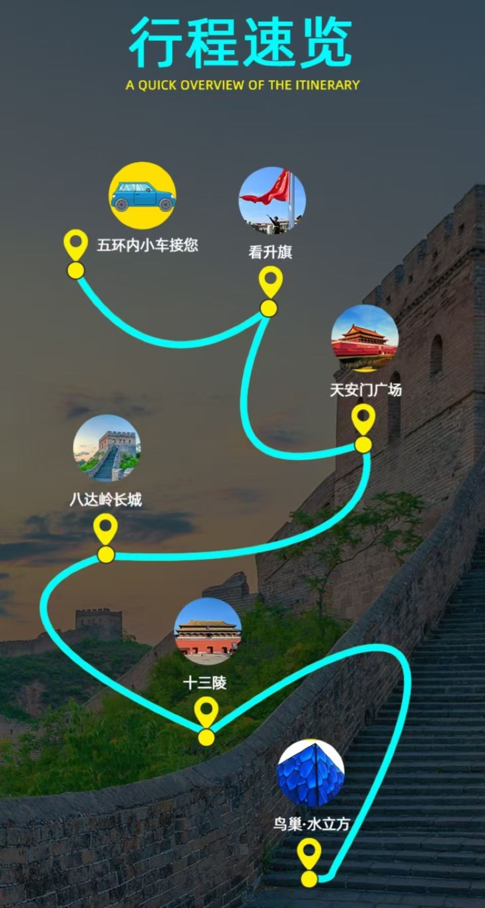 【五环内上门接】5点左右我们将会以小车上门接您前往旅游大巴集合,由于每天升国旗时间不同【夏季升旗4:50点左右,接驳时间大概2点左右】不看升旗的游客6点左右接。接驳时间根据游客的居住地址按顺序接驳、具体上门接的时间以司机或导游当天早上通知为准,如若看升旗,请在vx小程序页搜索天安门预约,也可联系在线客服,【看旗流程】因天安门广场要排队安检,早上通过安检之后自行找位置观看升旗,升旗结束之后统一集合出发去八达岭长城。