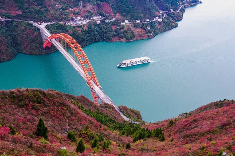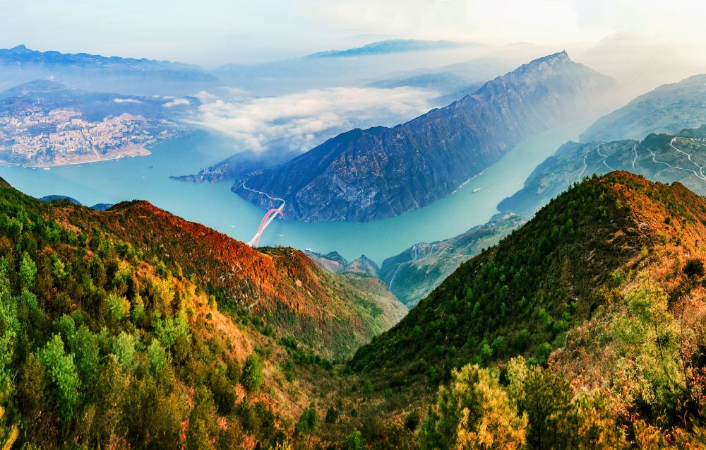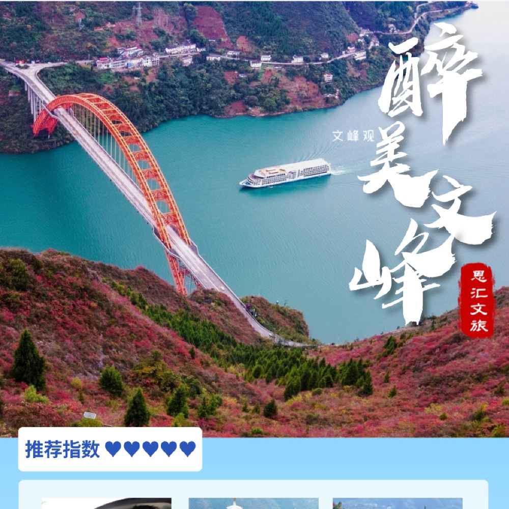 文峰景区与巫山县城隔江相望,景区以山为骨、水为魂、绿为脉、文为的建设特色与风格,是集生态防护、道教体验、游览观光、健身娱乐功能于一体的城市郊野公园。景区亭、台、楼、阁别致、新颖,特别是沿山脊修建的长廊,俯瞰长江,看似险要,走在上面是另一种特殊的享受。文峰景区是国家4A级景区,景区核心文峰观始建干明代,为全直派道观,张三丰曾在此修行,峰顶山脊步游道长8公里,既可观赏高峡出平湖,又可欣赏长河落日、俯瞰长江滚滚来,这里人文资源与自然风光交融一体,驻足漫山红叶之中,俯瞰高峡平湖之雄伟,远眺巫山云雨之变幻,回望移民新城之唯美,悟道天人合一之境界。“文峰来兮醉文峰,我自超然天地中”的感觉便会油然而生。