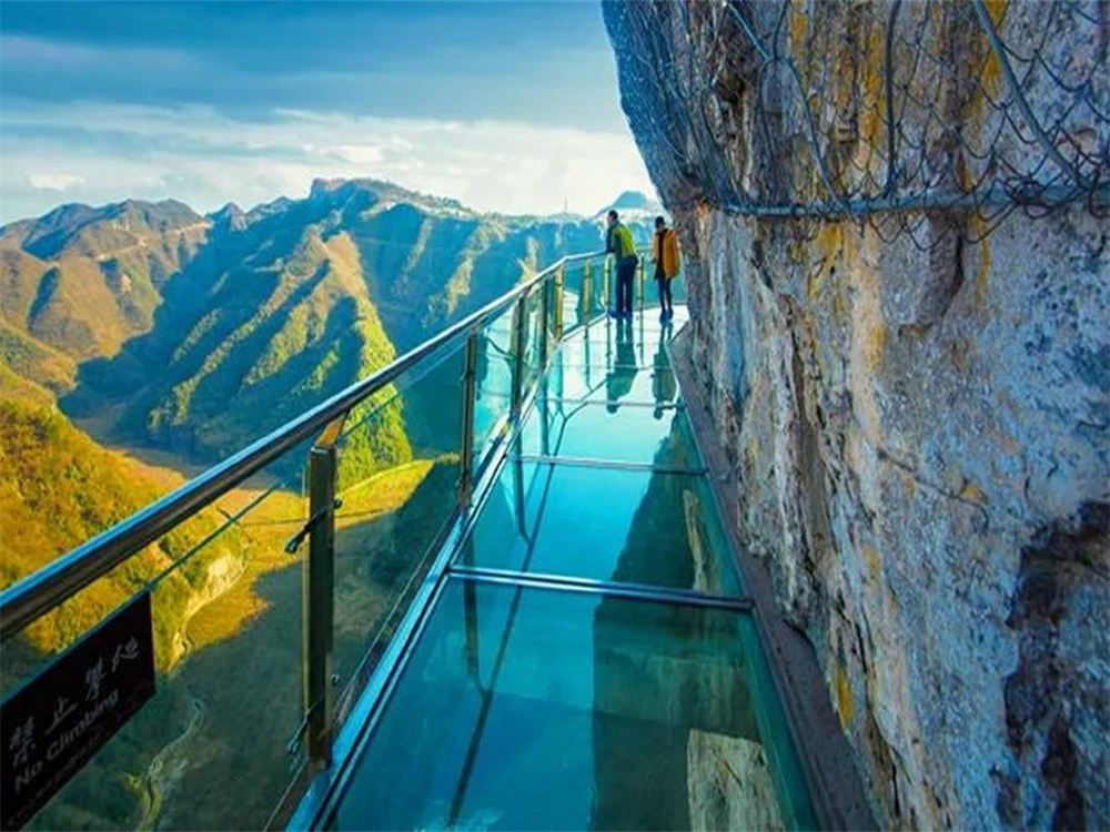 ※ 玻璃天桥——玻玻璃天桥位于朱砂古镇黑硐子上方,全长126米,其中全透明玻璃铺设86米,距谷底相对高度约100余米!玻璃天桥的绳索是采用镀锌360钢索,七合一(将七根钢绳拧成一股)拉开,不仅坚韧无比,且具有很强的防腐防锈性能。在享受惊险刺激的同时,还能观赏千年矿洞黑硐子,远眺悬崖玻璃栈道惊险,一览众山秀丽奇特……体验观赏尽在脚下。