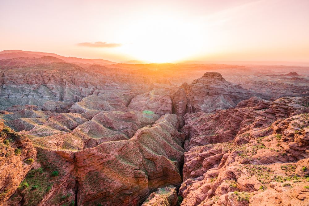 ▲ 照片仿佛是一幅用色彩与光影交织而成的梦幻画卷。画面以暖色调为主导,展现出一片壮丽无比的峡谷地貌。峡谷中的岩石有着红褐色与浅褐色的独特纹理,它们层层叠叠、高低起伏,就像大自然精心谱写的乐章,每一道纹理都诉说着岁月的故事。在画面的上方,太阳正缓缓下沉,金色的阳光如丝如缕地洒在远处的山峦上,仿佛给它们披上了一层金色的纱衣,让整个场景都弥漫着一种柔和而温暖的氛围。