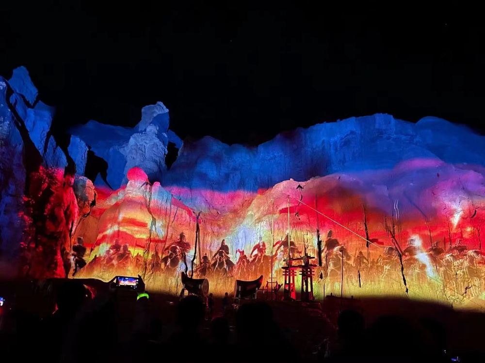 ▲ 照片犹如一场梦幻的光影盛宴,将人带入一个奇幻绚丽的世界。照片呈现出独特的风格,主体是那色彩斑斓的山体,在红、蓝、黄等多种颜色光影的投射下,山体仿佛被赋予了新的生命,每一寸肌肤都散发着神秘而迷人的光彩,形成了丰富的视觉层次。黑色的夜空作为背景,犹如一块巨大的幕布,将山体上的光影效果衬托得更加鲜明夺目。