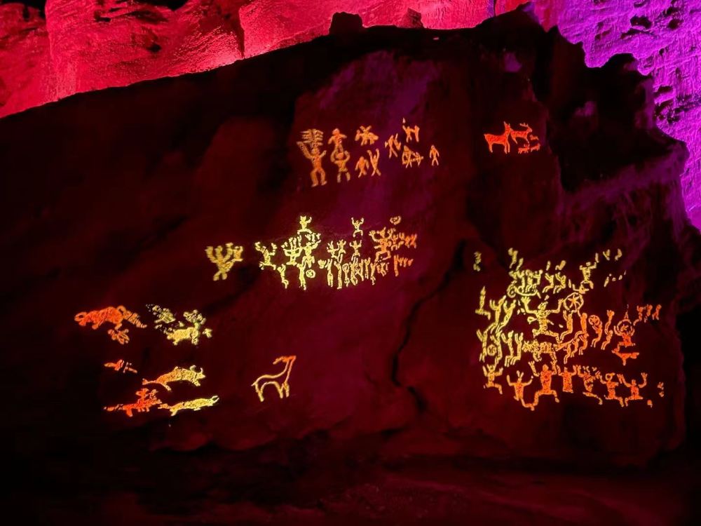 ▲ 照片宛如一扇通往远古文明的神秘之门,散发着令人着迷的气息。照片具有神秘的风格,主体是一块刻有古代岩画的岩石,仿佛是历史的见证者,静静诉说着古老的故事。岩画上雕刻着人物和动物的图案,人物或站立、或举手,动作栩栩如生,仿佛在进行着一场古老的仪式;动物图案中,鹿的形象尤为突出,灵动的姿态仿佛随时都会从岩石上跃出。背景的岩石被红色和紫色的灯光照射,营造出一种奇幻而神秘的氛围,仿佛将人们带入了一个充满奇幻色彩的远古世界。