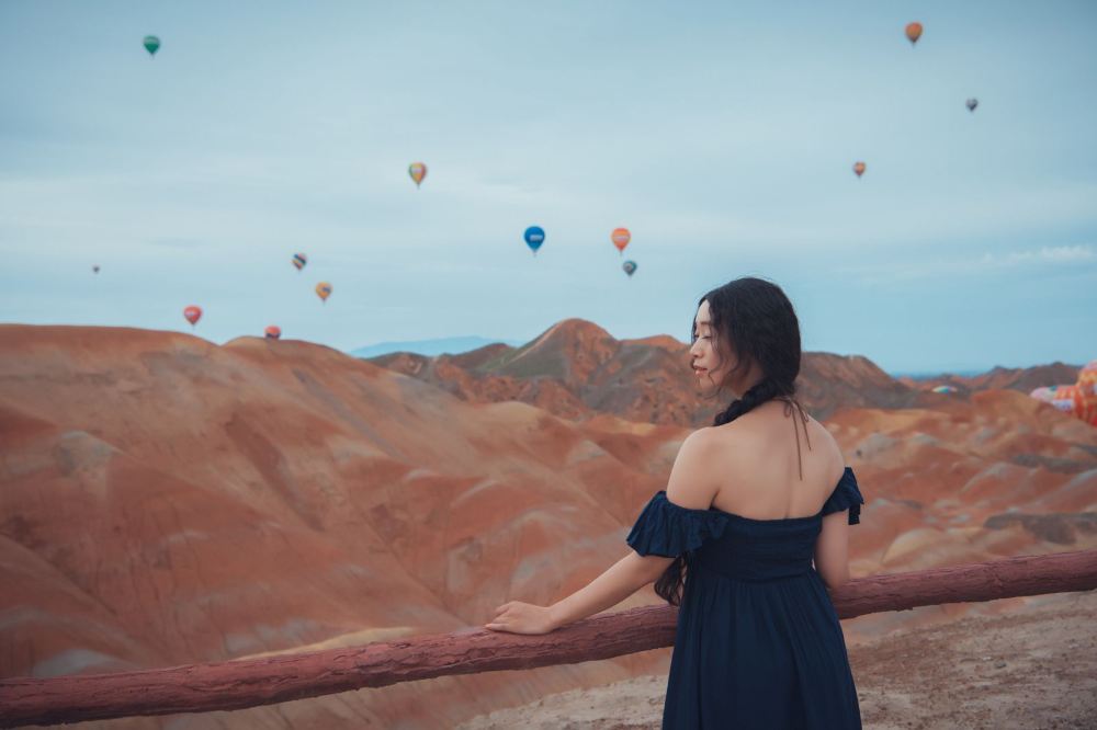 ▲ 照片营造出一种宁静而美好的氛围,恰似一首无声的抒情诗。画面中,一位身着深蓝色露肩连衣裙的女性背对镜头,她的长发编成辫子柔顺地垂在身后,尽显优雅与温婉。她右手轻轻扶着那根红褐色的栏杆,仿佛在与这大自然的美景进行着无声的对话,目光望向远处色彩斑斓的丹霞地貌,仿佛被那壮丽的景色所深深吸引。淡蓝色的天空作为背景,几只颜色各异的热气球在其中悠然飘浮,为整个画面增添了一份生动与活泼,仿佛是天空中跳跃的音符。
