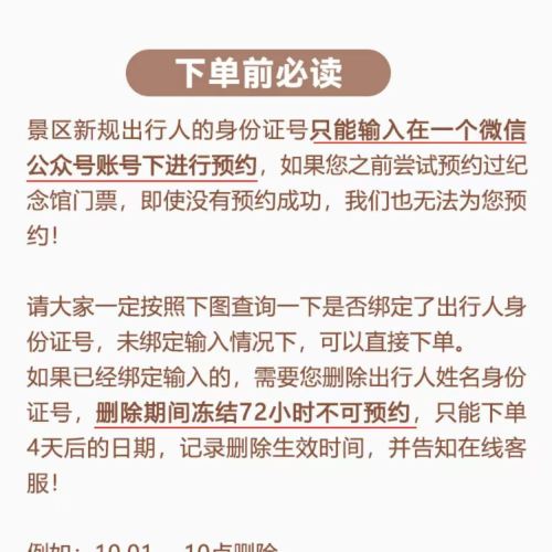 ▲ 温馨提示:下单预订成功不代表抢票成功,请仔细阅读携程官网公告后再下单,每位用户可绑定1位用户【微信南屠官方小程序】,如果您的信息已经绑定的,需要删除72小时后我们才预约,删除有三天的冻结期,谨慎操作,定3天后的日期我们才可以代预约,定的越早越好出票,预约成功的几率越大,儿童/老人/港澳同胞/护照等优待证件都需要预约,请正常下单,因没有下单的导游在景区无法入园,商家不承担责任。如遇门票售馨约票不成功,工作人员会在预约抢票日次日及时联系您协调变更出行日期或无损退订,旅行社一旦预约成功,无法更改日期,