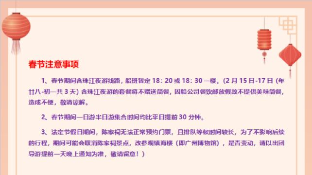 1、春节期间含珠江夜游线路,船班暂定18:20或18:30一楼。(2月15日-17日(年廿八-初一共3天)含珠江夜游的套餐将不赠送简餐,因船公司餐饮部放假故不提供美味简餐,造成不便,敬请谅解。