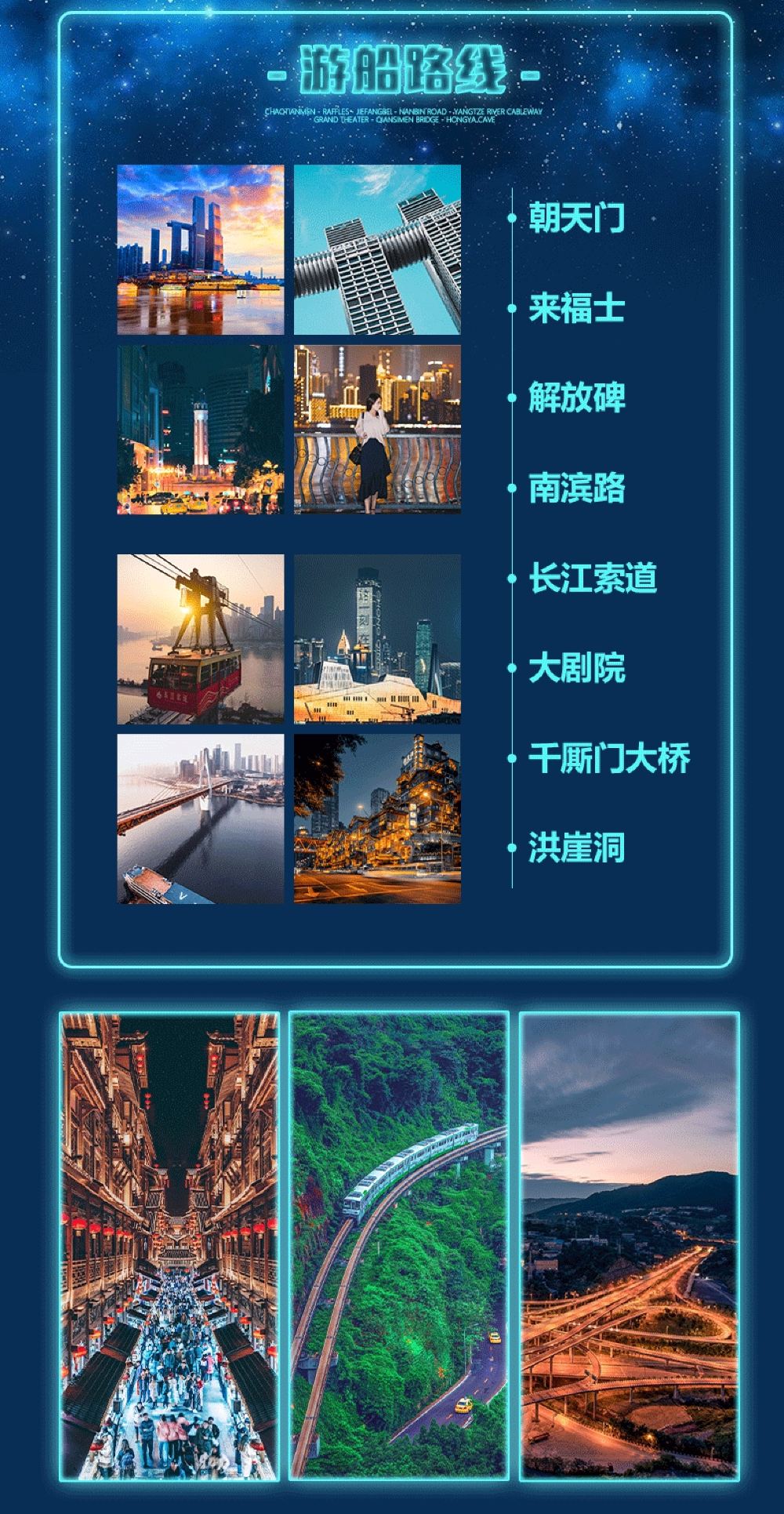 朝天门/朝天宫系列:请携带有效证件在洪崖洞1/2号码头登船。 参考开船时间:19:40--20:45,实行滚动发班;航行时间约45分钟左右;