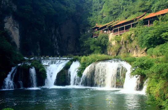 ▲ 天河潭是贵阳的“喀斯特童话世界”,集自然奇观与文化底蕴于一体 。 水旱溶洞 :水洞乘船穿梭地下河,洞内钟乳石在彩灯映照下如龙宫秘境;旱洞需步行探秘,“一线天”“千年神龟”等奇景令人称奇,洞内常年18℃,清凉宜人。 - 天生桥瀑布 :高20余米的天然石门,瀑布从桥洞飞泻而下,晴天可见彩虹,气势磅礴又不乏浪漫。 - 钙化滩瀑布 :宽达210米,是目前国内第一宽的钙化滩瀑布。丰水时,瀑布如脱缰野马轰鸣而下,气势磅礴;枯水时,水流如丝如缕,洋洋洒洒,别有韵味。 - 卧龙飞瀑 :宽二十余米,高十余
