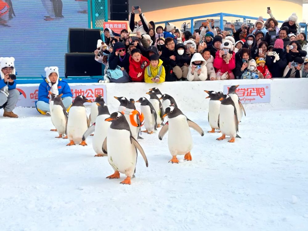 ▲ 这是哈尔滨极地公园的 “淘学企鹅” 巡游现场:排着队的企鹅摇摇摆摆走在冰面上,身旁有工作人员温柔引导,围观的游客都被这些南极萌宠的憨态吸引。在这里不仅能近距离观察帝企鹅、阿德利企鹅的习性,还能轻松解锁与企鹅同框的治愈打卡照。