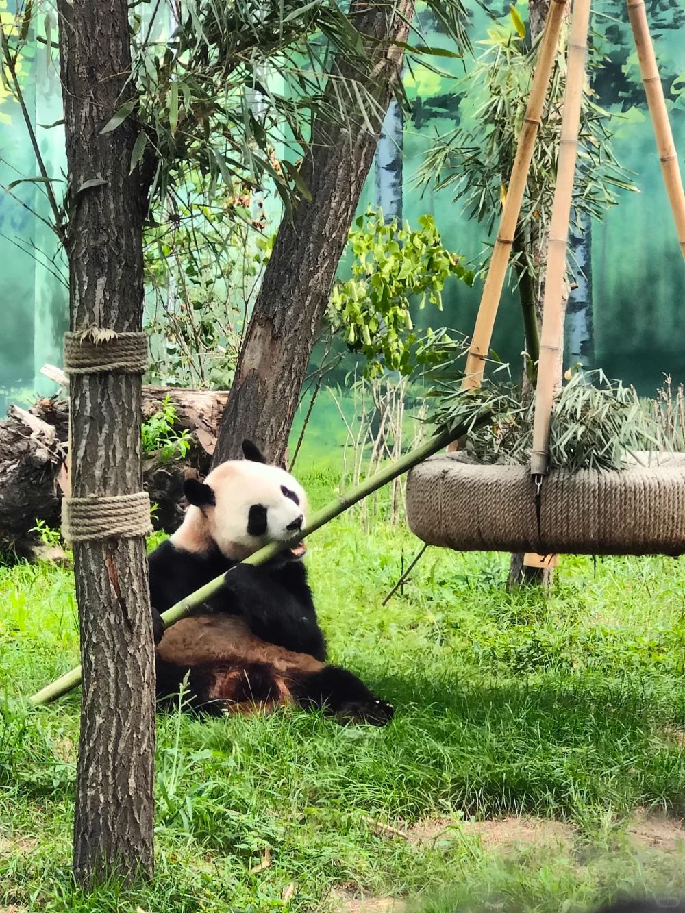 ▲ 这是太阳岛熊猫园的 “芝士” 或 “芝麻” 双胞胎之一 —— 它正抱着鲜嫩的竹子,在被 88 种花卉环绕的活动场里悠闲进食。场地保留了原生树木与玩乐设施,搭配模拟熊猫原生境的环境设计,能看到熊猫非常放松的软萌状态,治愈感直接拉满。