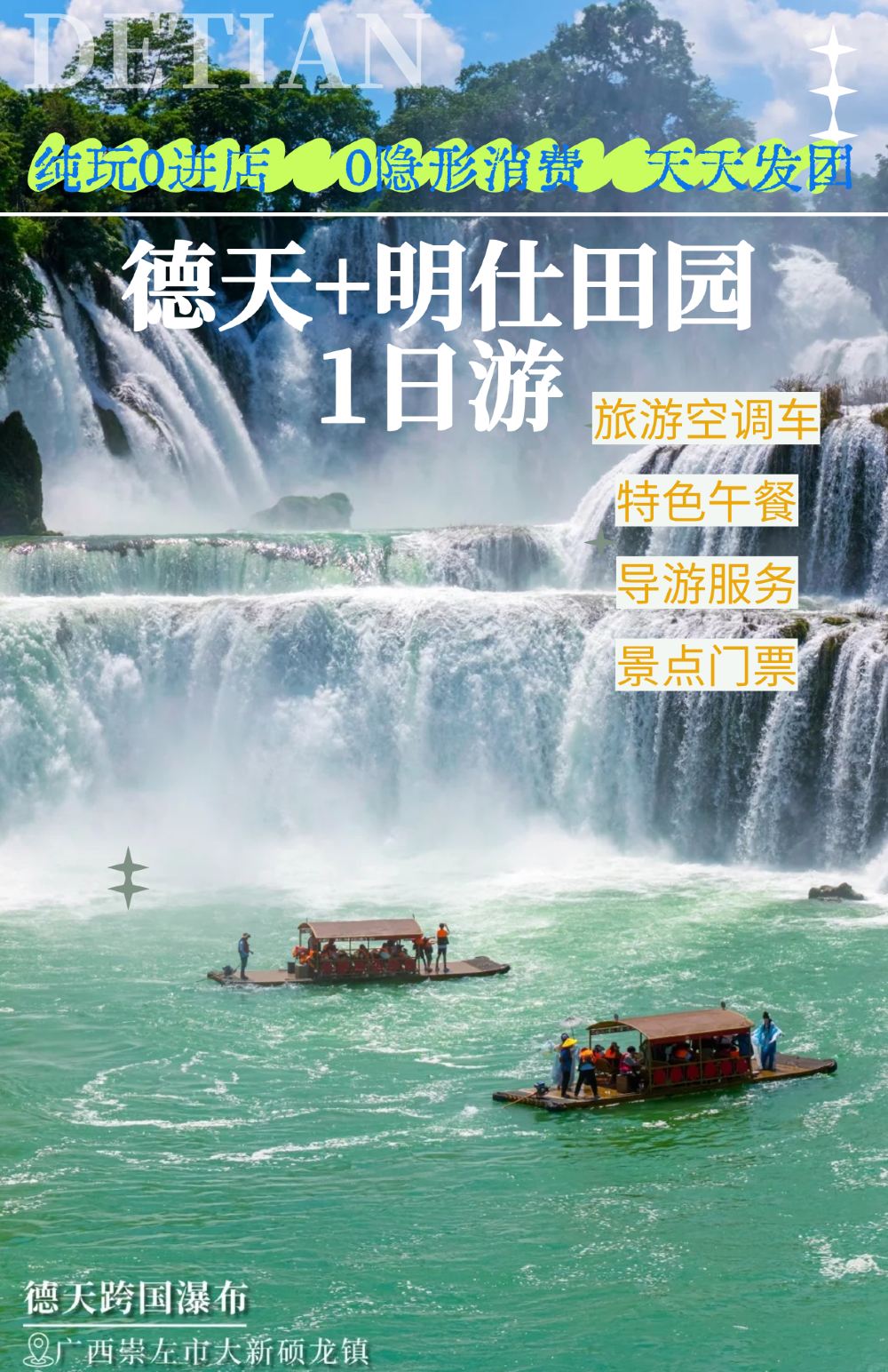2、德天瀑布风景区内电瓶车(单程10元/人)、竹排(48元/人)(具体实时价及套票价以景区为准)等以及景区的集市、商店均属于景区配套设施项目,供游客了解当地特色文化之用,非团队旅游安排的自费及购物点,敬请知晓!