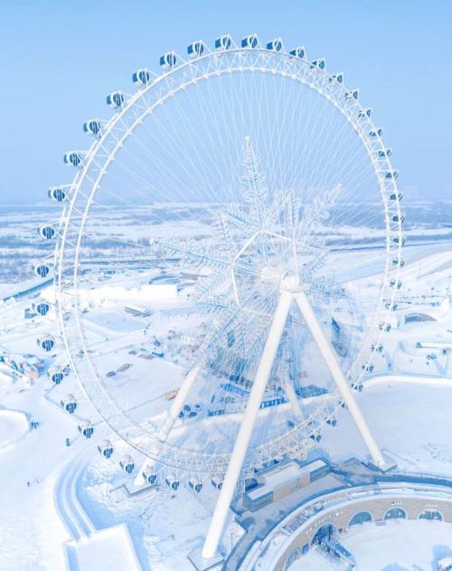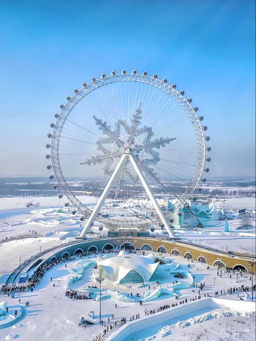 ▲ 冬日里,雪地上的摩天轮显得安静又梦幻,缓缓转动之间能俯瞰冰雪大世界的全景。白天的光线清透,非常适合拍摄大场景和旅拍大片,让游客从高处感受哈尔滨的冰雪魅力。