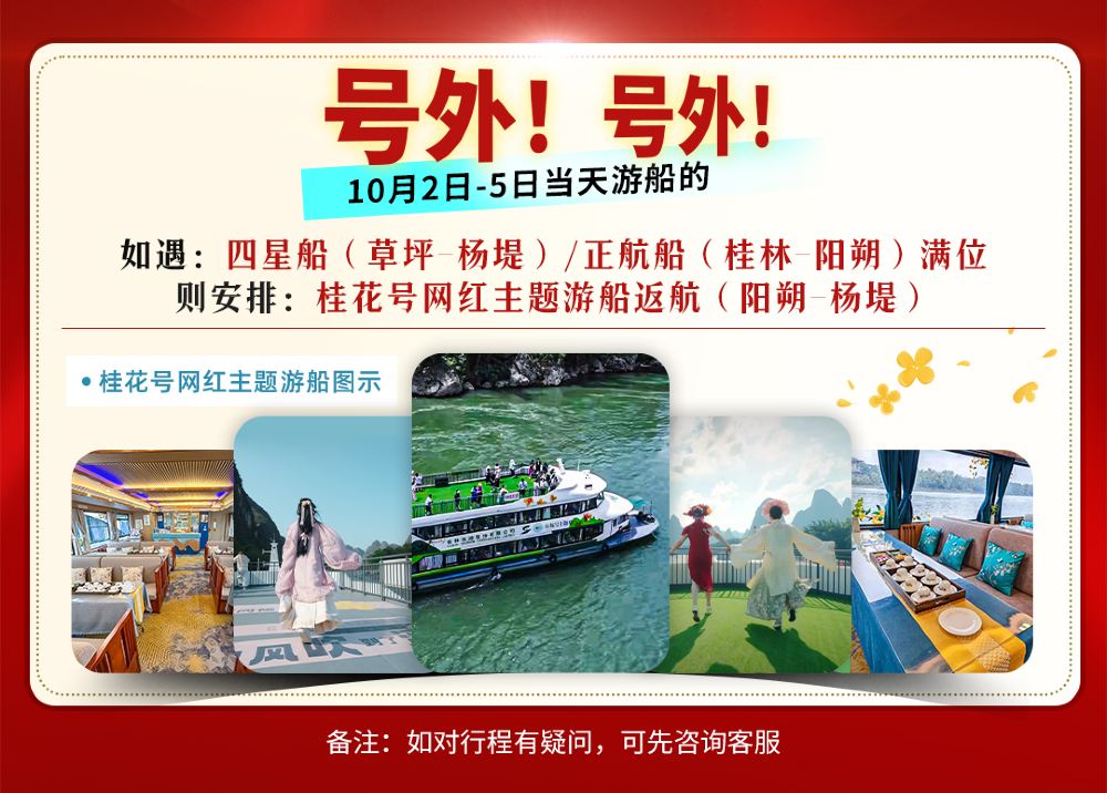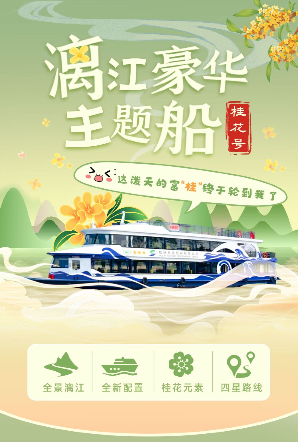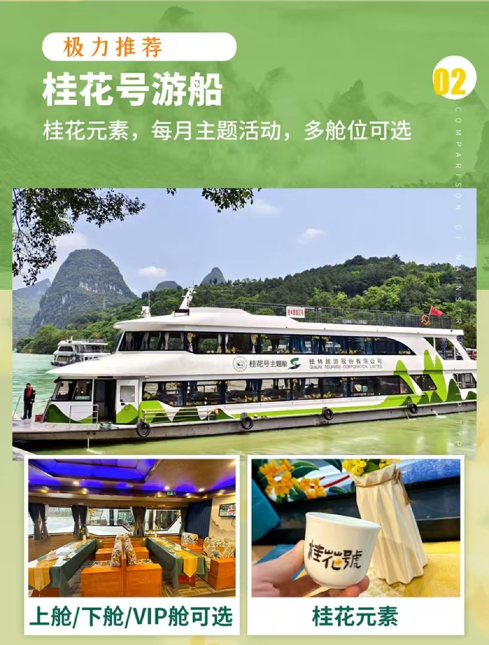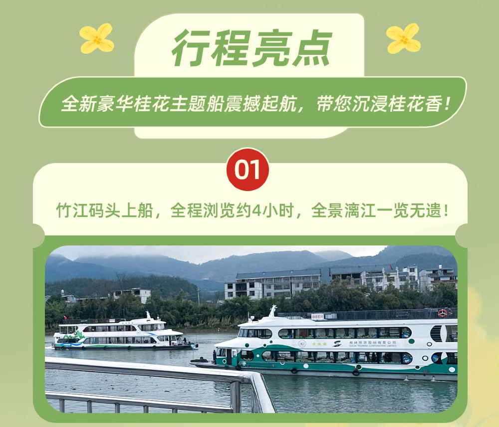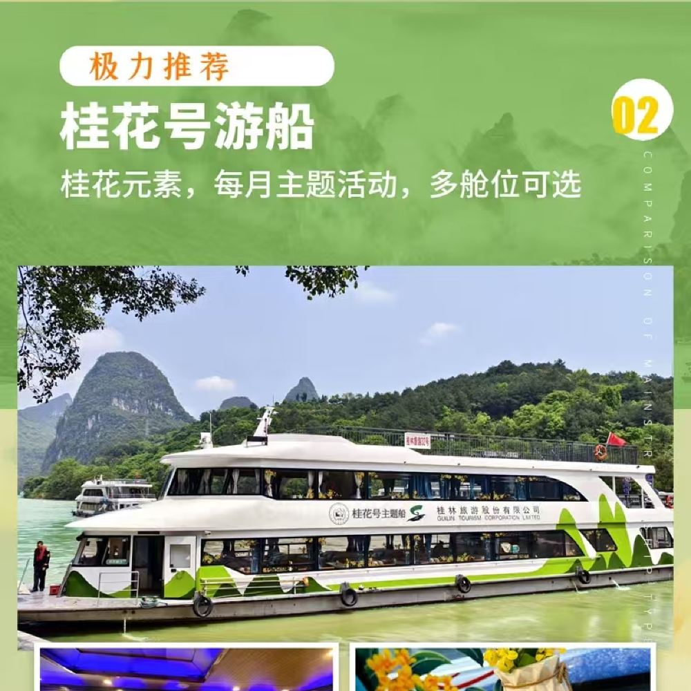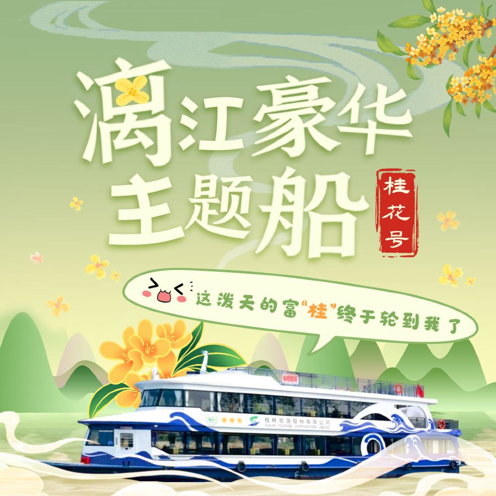 桂花号主题游船桂林漓江风景一日游【含接送码头+全景5A漓江】【船游美丽的特色河流之桂林漓江,桂林山水精髓的所在,让您不虚此行!】