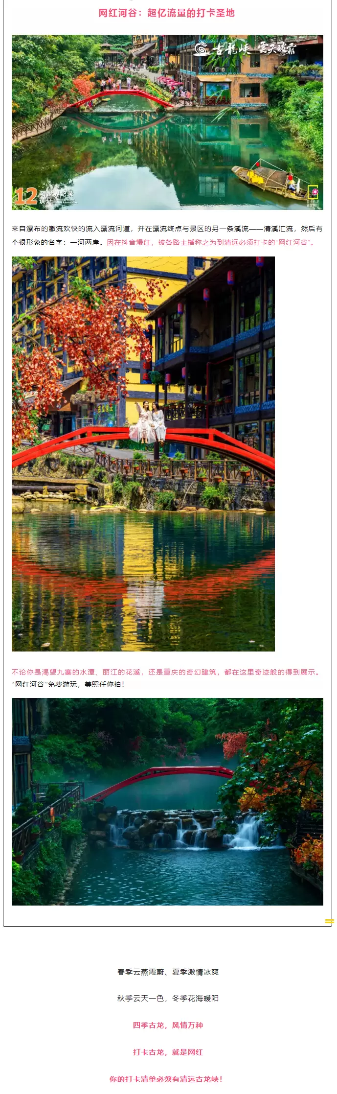 网红河谷,青山碧水红桥,花溪叠瀑如画
