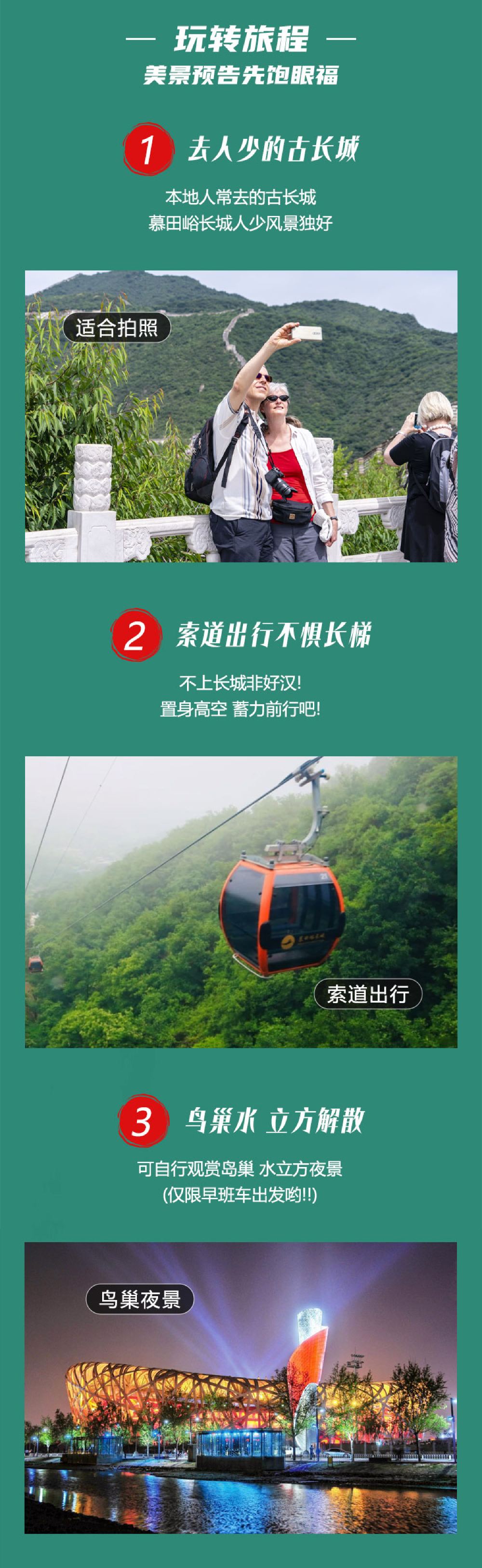 1.行程路线:老舍茶馆前门店-东四地体站-芍药居地铁站-游览慕田峪长城-返回北京-鸟巢/水立方解散