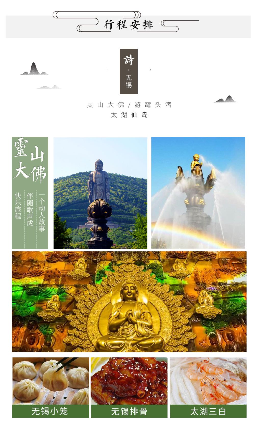 游览【灵山梵宫】灵山梵宫建筑气势磅礴,布局庄严和谐,总建筑面积达7万余平方米。灵山梵宫的建筑形式突破传统,以石材等坚固耐久材料为主,大量运用高大的廊柱、大跨度的梁柱、高耸的穹顶、美轮美奂厅堂等,既体现佛教的博大精深与崇高,又将传统文化元素与鲜明时代特征相融合