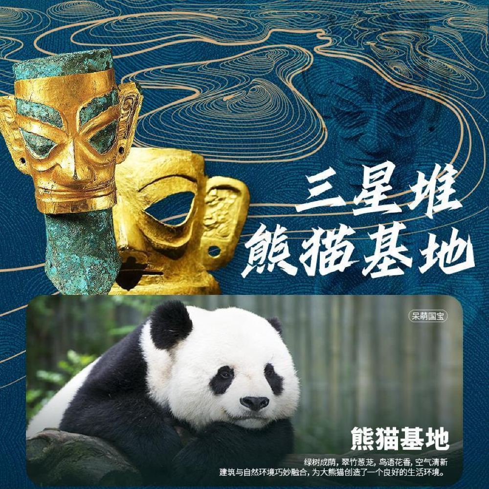 熊猫基地、三星堆或金沙博物馆大门票(二个景点老人优惠票导游现退 80;单熊猫基地免票退 30; 单三星堆免票退50)