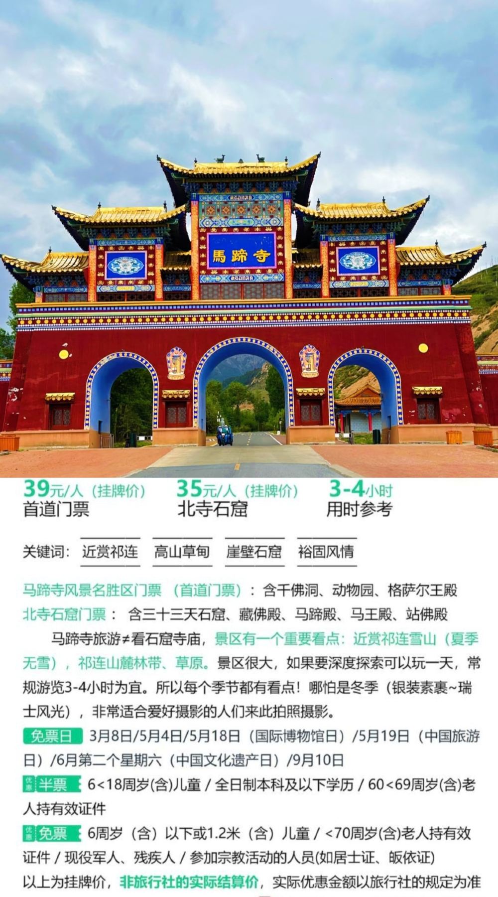 1、成人包含马蹄寺首道门票39元/人