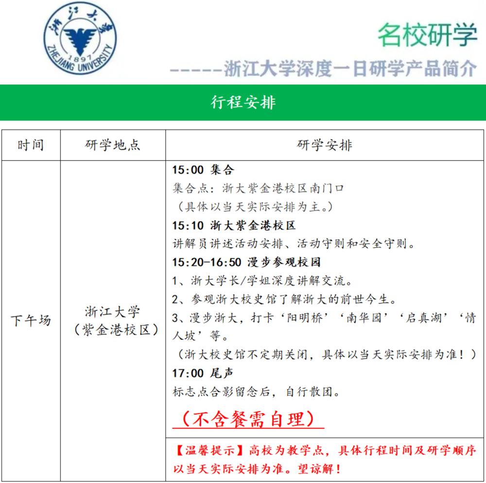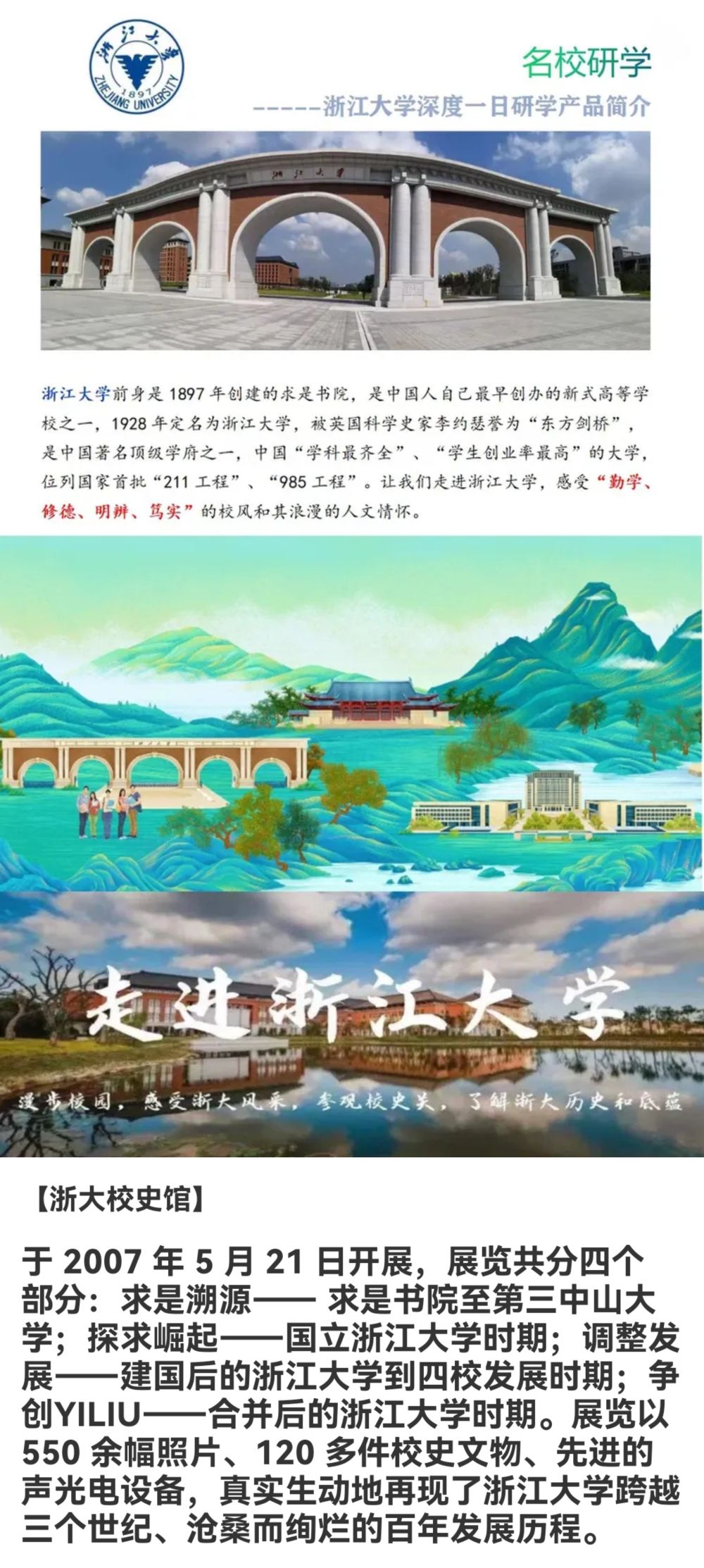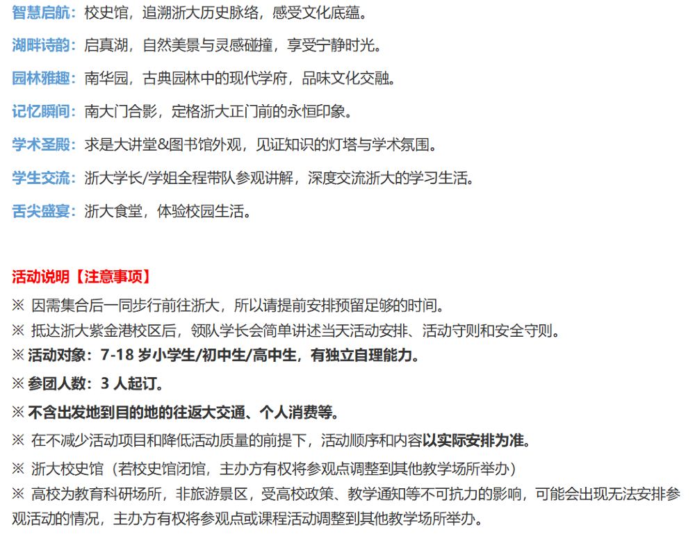 【产品亮点】套餐包含进校预约和全程参观讲解,带队学长/学姐都是浙大学子,会分享在学校的生活日常和学习经历,沿途参观学长/学姐还会介绍浙大的风景和历史!