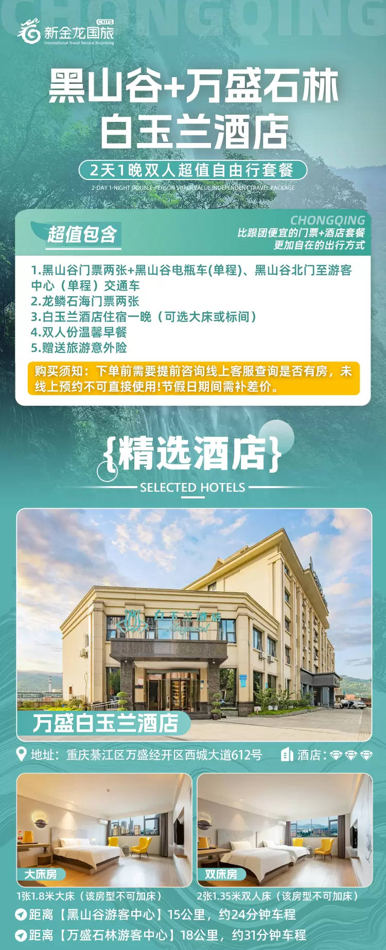 【酒店套餐】万盛白玉兰酒店2天1晚+双人黑山谷+双人万盛石林门票+双早