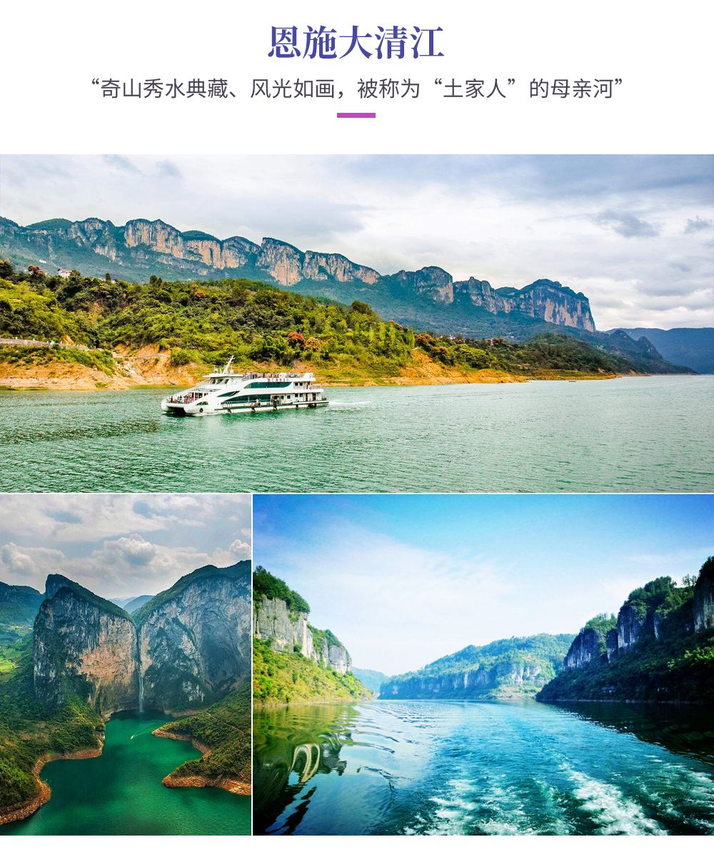 清江,古称夷水,全长八百里,自恩施州利川齐岳山脚下龙洞发源,至宜昌宜都入率长江。或咆哮奔腾,或 飞珠溅玉,或潜伏地心,或激荡明崖,自西 横贯恩施土家族苗族自治州,哺育了世世1个 家儿女。其中好看的为清江蝴蝶崖段,两岸绝壁宛如两扇蝴蝶翅膀,栩栩如生,甚为壮观。