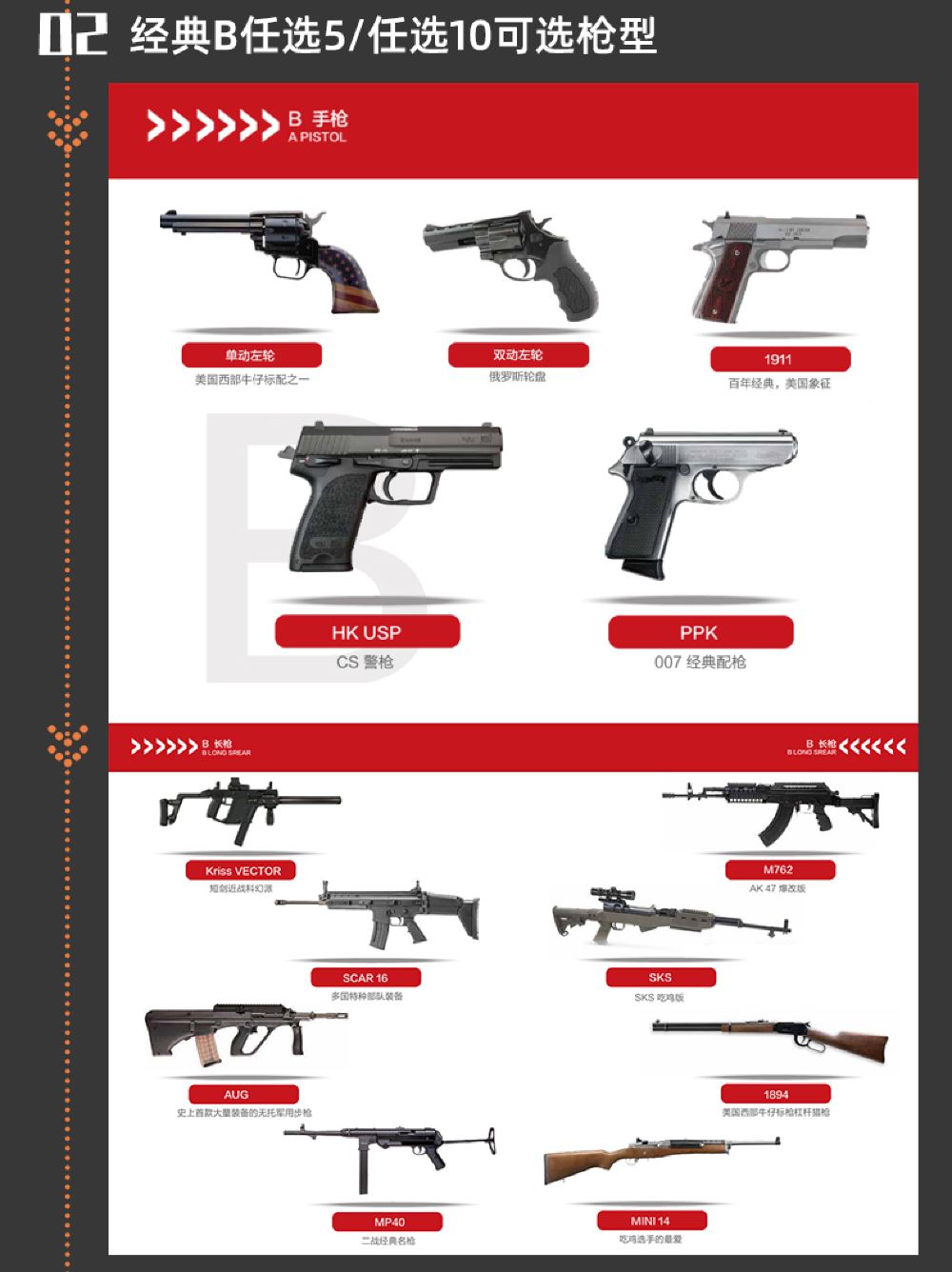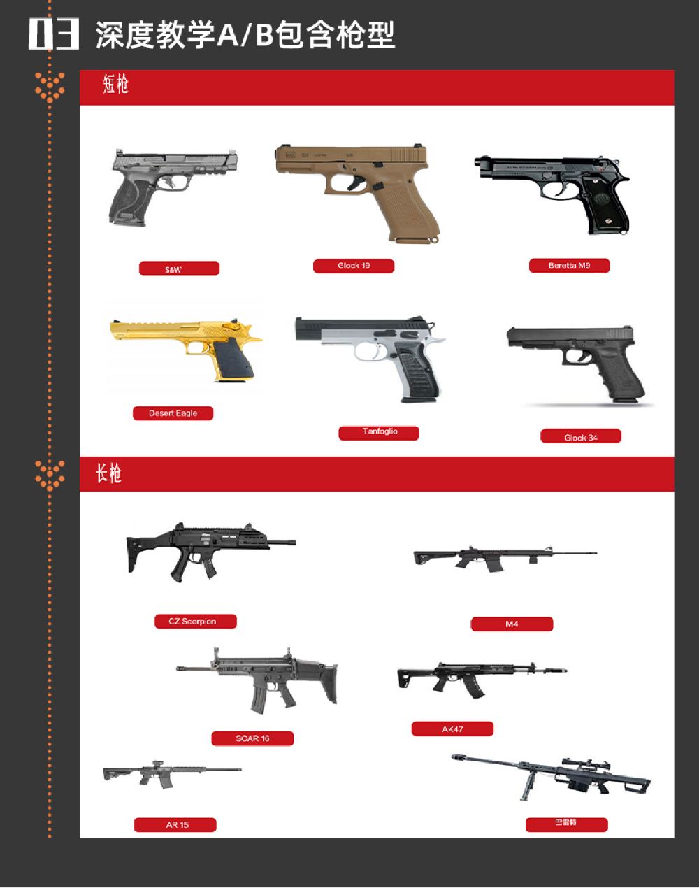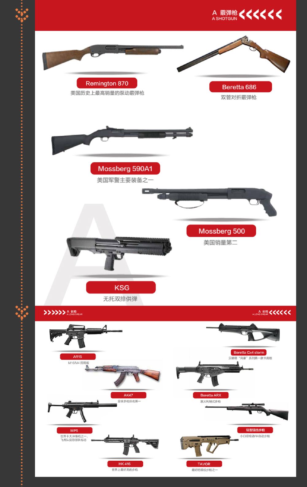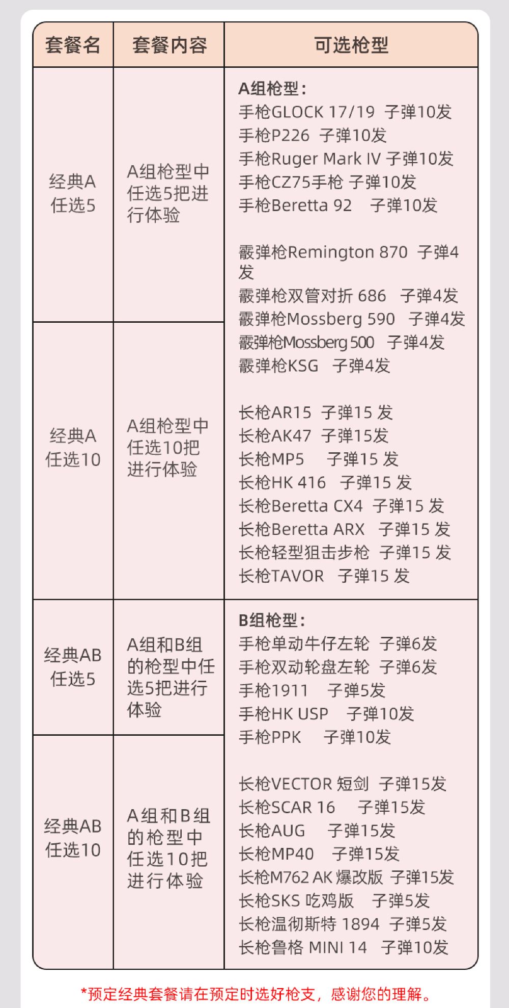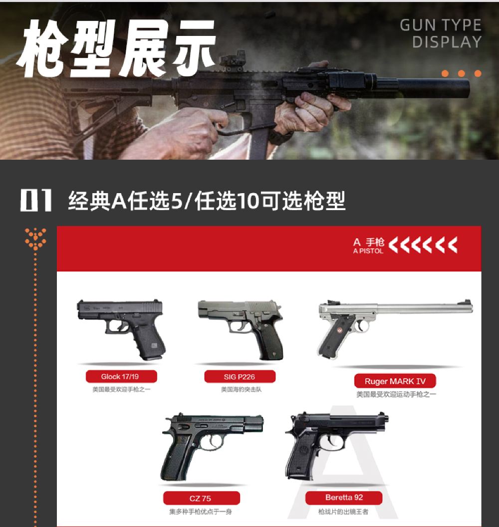 我们提供长枪、短枪等几十种枪型可选,可任选5把或10把组合成套餐。