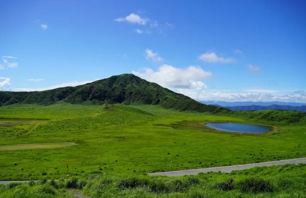 草千里ヶ浜:宛如绿色海洋的广阔草原,周围是火山地貌,景色壮丽。