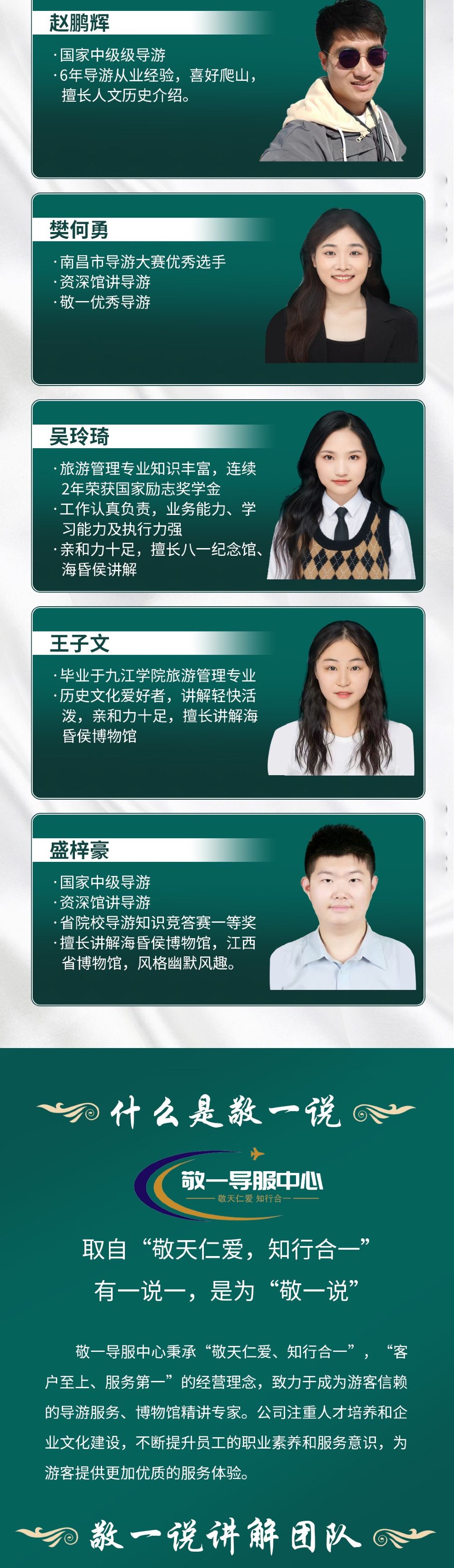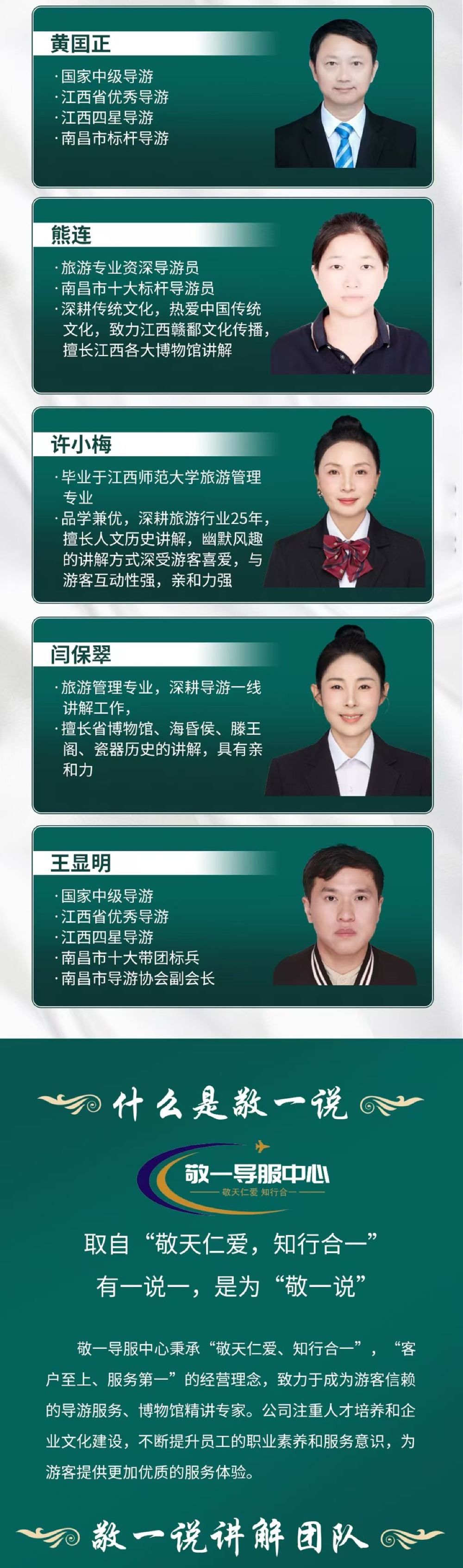 ▲ 一、企业概况 南昌敬壹旅游服务有限公司(敬一导服中心)是一家专注于导游服务企业,致力于为广大游客、旅行社提供专业、优质的导游服务。