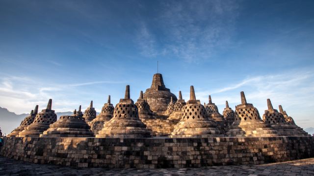 ▲ 婆罗浮屠寺静谧优美,圆形露台上耸立着数十座钟形佛塔。每座佛塔都依偎在青山绿水和远处火山的映衬下,构成一幅令人叹为观止的全景图。温暖的阳光映照着寺庙精美的石雕,凸显其宏伟对称的设计——这是印度尼西亚佛教遗产的标志性象征。
