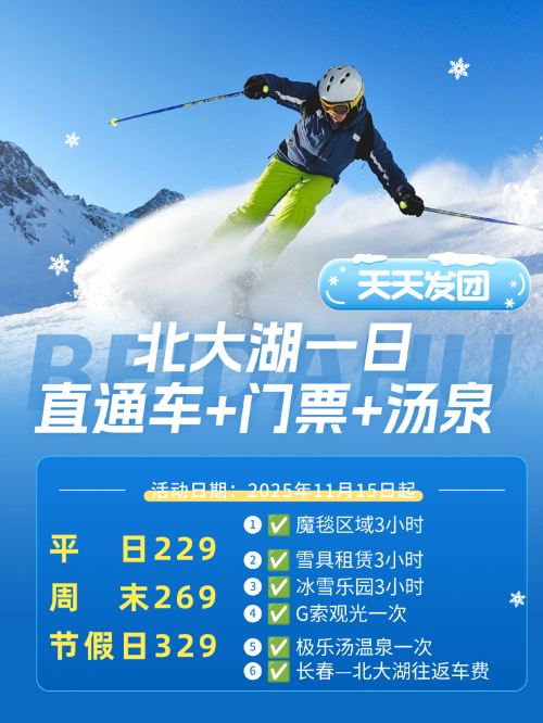 长春北大湖滑雪直通车+门票+汤泉