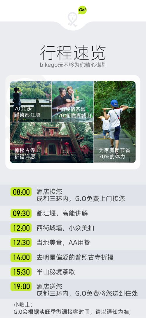 由于3人以下无法成团,为避免影响您的游玩,“bikego” 工作人员会在出行前一天23:00前(出发地当地时间)通知您并全额退款或帮您改期哦~
