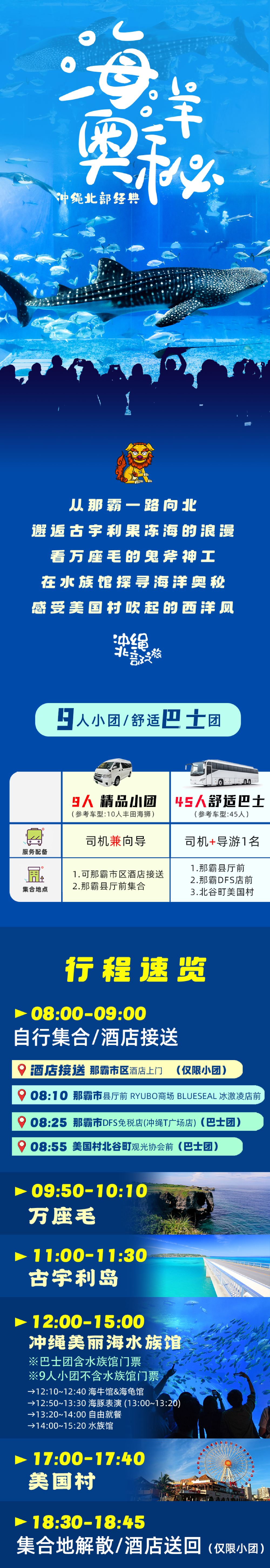 冲绳北部经典一日游【9人小团/巴士团 | 可含水族馆门票】【[经典北部]漫步古宇利岛欣赏浪漫大海,万座毛观赏大自然鬼斧神工,美国村享受异域风光!】