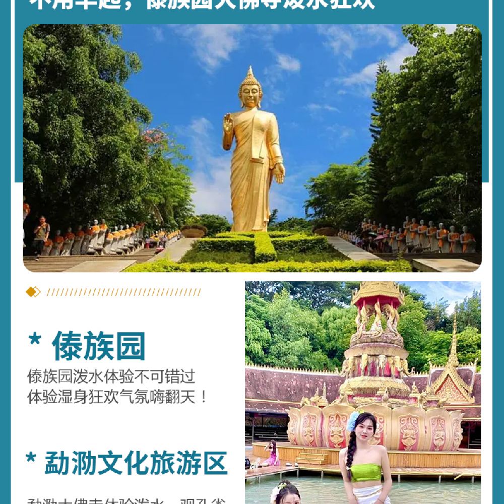 【泼水活动】泼水活动开始前有十多分钟的民族表演,展演一圈,敬水仪式开始后大家就开始泼水了,大家可以通过泼洒水祝福,期间会有蹦傣迪环节,享受欢快的气氛。