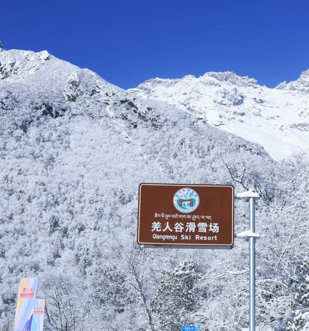 ▲ 羌人谷滑雪场标识牌立在雪林间,背景雪山雾凇连片,多语种标识衬着晴空,冬日雪场辨识度拉满