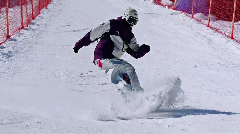 ▲ 滑雪者身着紫白拼色装备,在雪道上侧身滑行,雪沫飞溅。红网围栏衬着皑皑白雪,动作利落尽显雪上运动的动感与活力