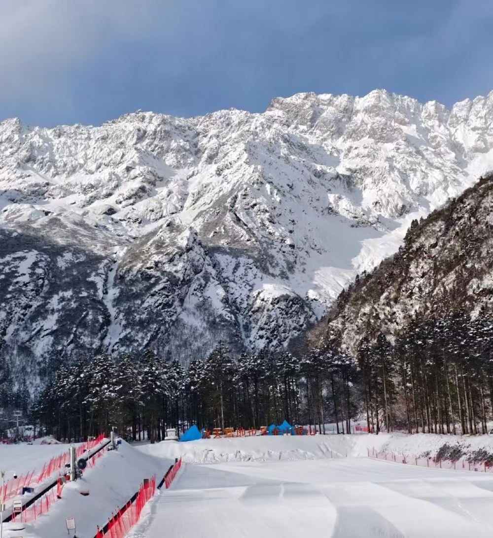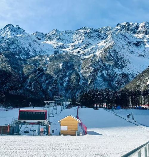 ▲ 雪场里缆车与木屋错落,背景雪山覆雪、林木裹银,晴空衬得冬日雪境开阔,尽显滑雪地的清爽氛围