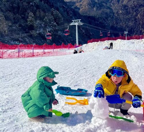 ▲ 雪地上俩孩童玩雪,一黄衣娃堆雪团,一绿衣娃握铲,缆车作背景,童趣满溢