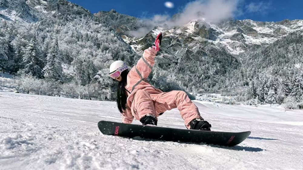 ▲ 粉装女生单板滑雪,白盔粉镜配粉手套,后山云雾绕林,动作飒爽,雪场活力拉满