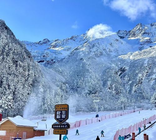 ▲ 汶川羌人谷雪场,牌面写“此生必来”,雪山缆车衬着晴空,滑雪者点缀其间,景美惬意