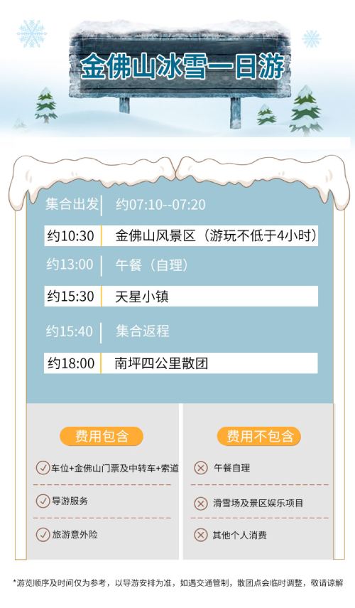 1、因天气不可控,景区是否有积雪,建议咨询景区为准;