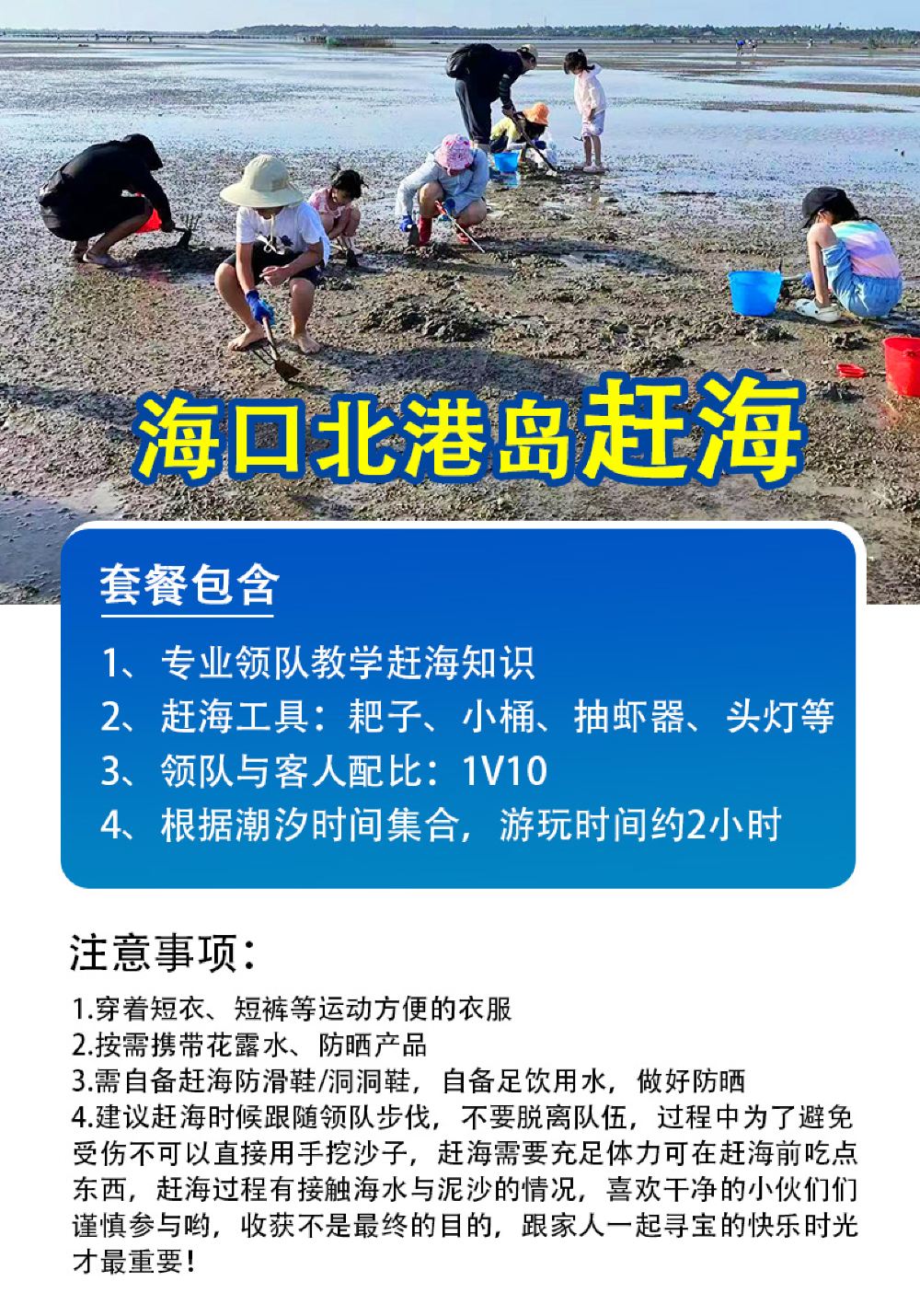 海南海口北港岛一日游【专业向导带领赶海2小时,包含赶海工具】【趣味游玩,遛娃好去处,让小朋友挖沙寻宝,体验收获的快乐,本地向导接待,专业包抓到】