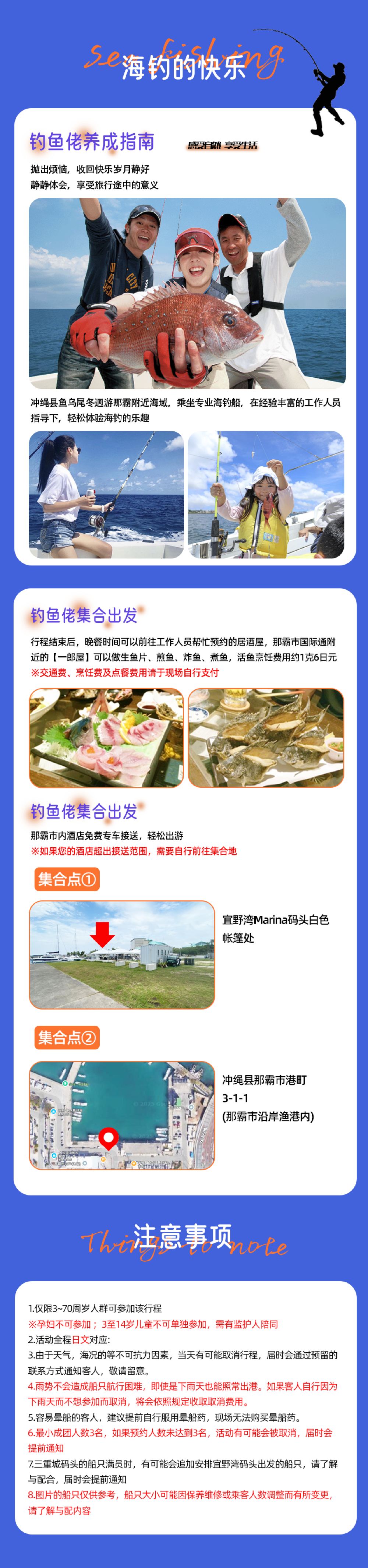 ①因冲绳海钓船位有限,为了提高预约成功率,建议咨询后客服后先下单等待再次确认,敬请谅解!!!