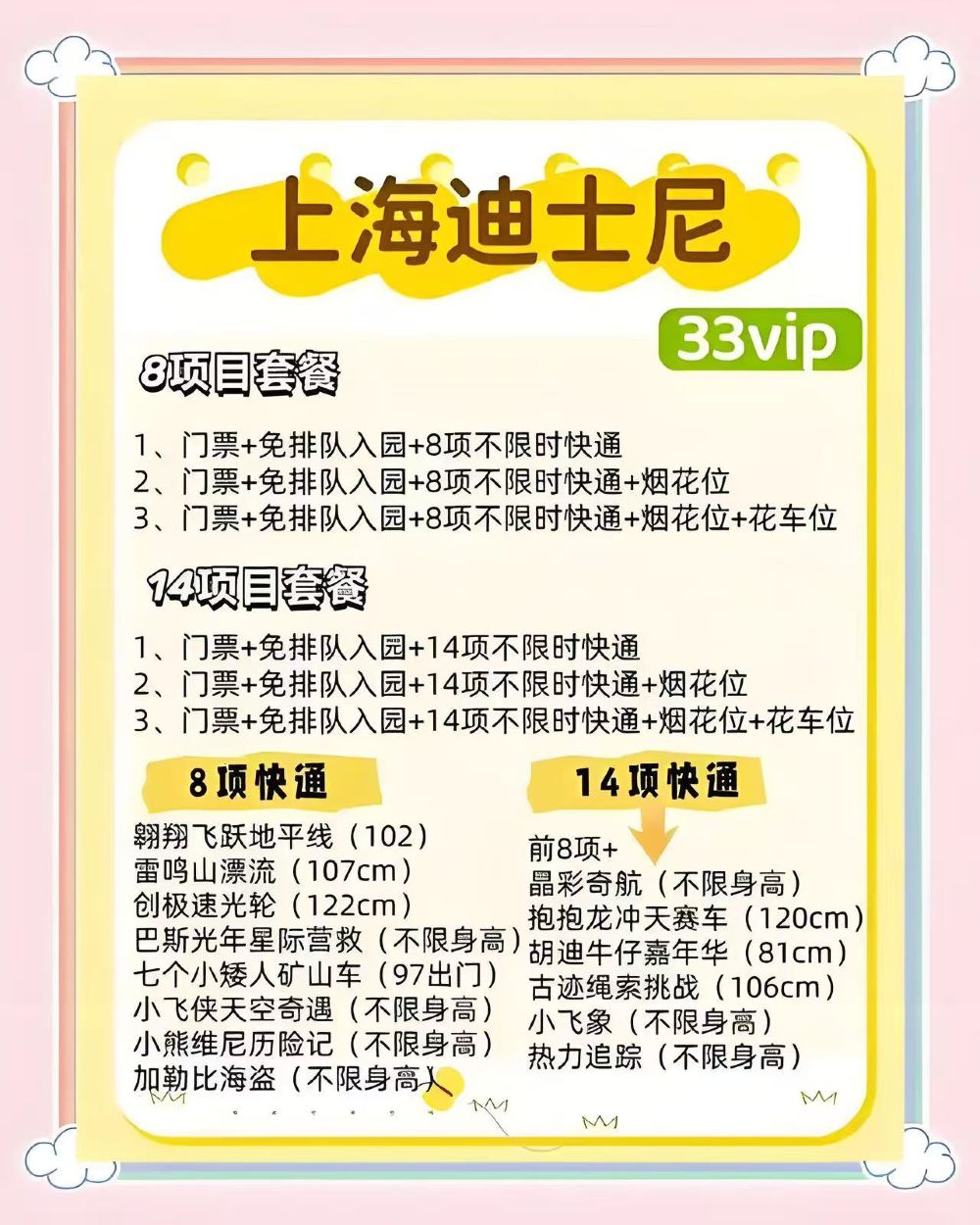 33VIP票8/14项快通+快速入园免绕胡+导游+花车+烟花【①可选:[33VIP]8或14项快速通行[含门票]热门项目玩好后继续带玩5个其他项目+4场演出】