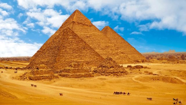 吉萨金字塔位于埃及开罗西南约10公里的吉萨高地,是古埃及金字塔建筑艺术的杰出代表,也是古埃及文明的重要象征。主要由胡夫金字塔、哈夫拉金字塔和孟卡拉金字塔组成,分别属于第四王朝的三位法老。其中胡夫金字塔规模较大,在很长一段历史时期内保持着较高的建筑高度;哈夫拉金字塔因地势较高而显得格外雄伟,附近矗立着著名的狮身人面像;孟卡拉金字塔则以精美的墓室装饰著称。吉萨金字塔群以其独特的设计、宏大的规模和精湛的建造工艺闻名于世,是研究古埃及历史、宗教与科技的重要遗存,在世界古代七大奇迹中具有突出地位。