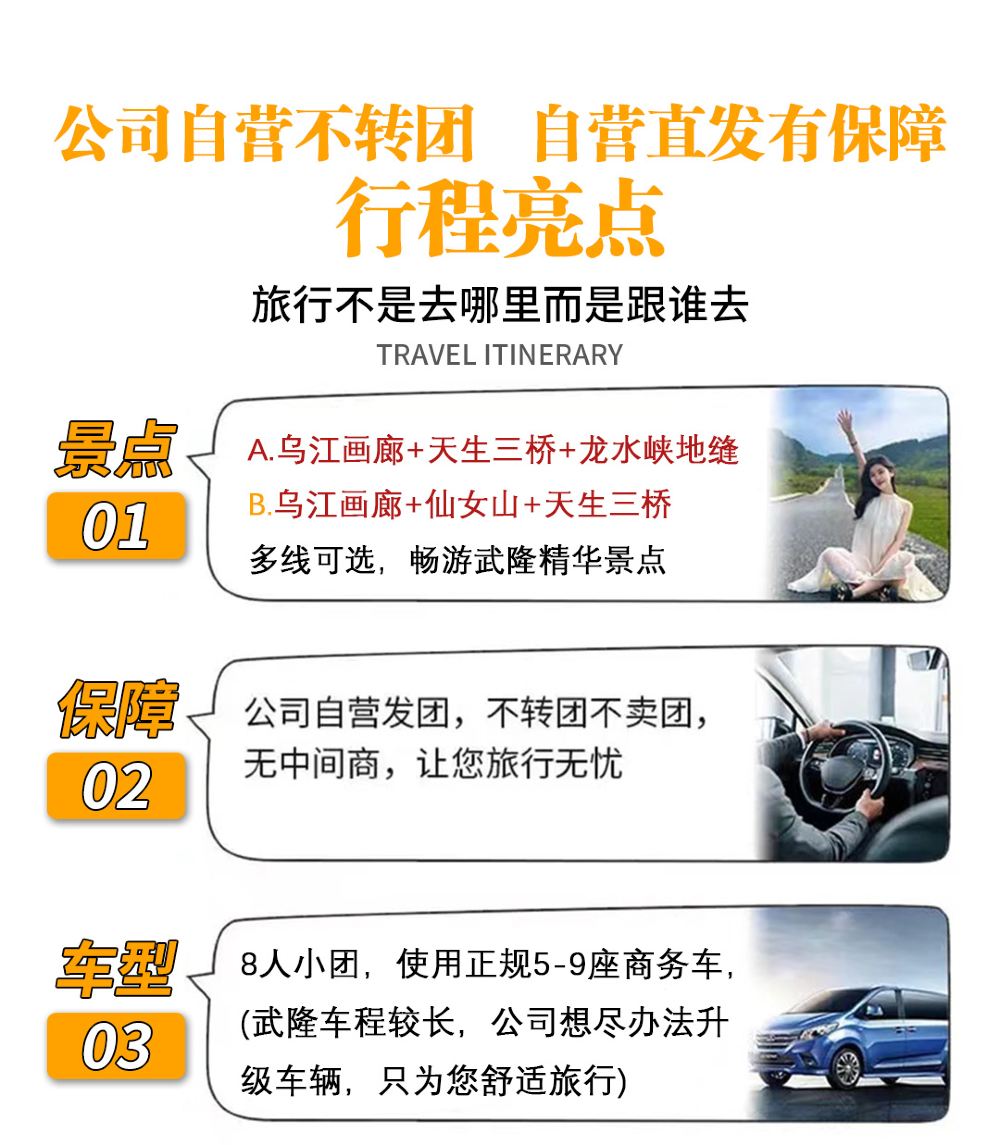 【睡醒出发8点班】武隆天生三桥+龙水峡地缝+乌江画廊一日游【【真正小团引领者】2-8人精品小团,东风,福田、大通、7座别克,5座轿车,享受大空间!只做感动人心】