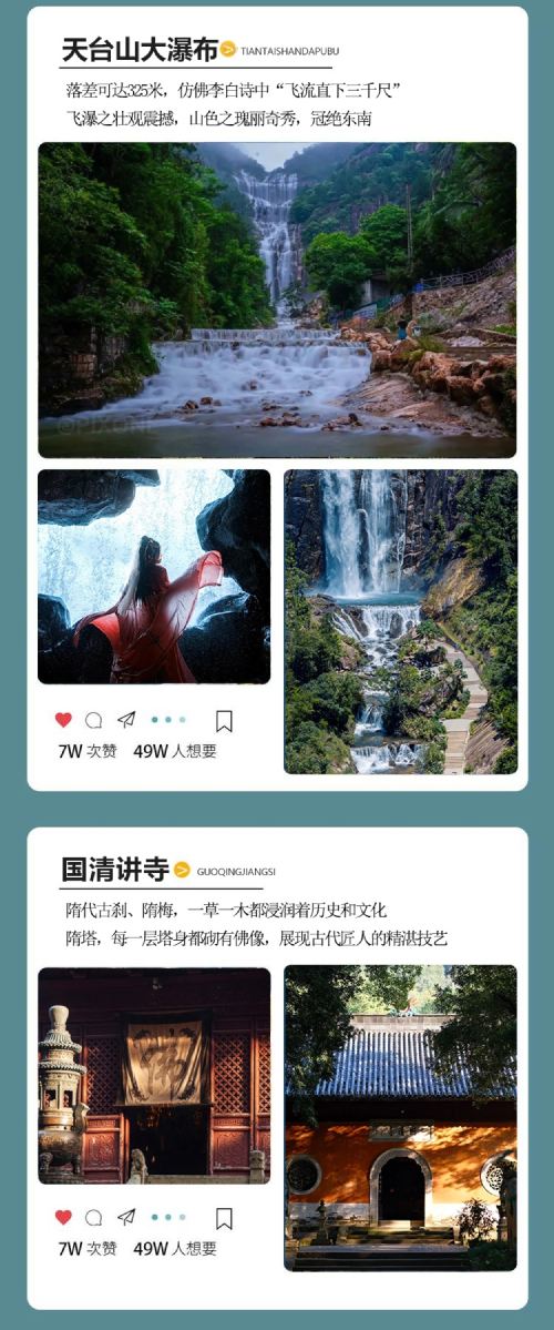 天台山大瀑布又称桐柏瀑布,也称三井瀑布。主体大瀑布总落差 325 米,最大宽度90米,主要景观有:九级飞瀑(九瀑:玉梭飞流、七八瀑:幽谷叠瀑、六瀑:悬瀑风雷、五瀑:阆苑仙葩、四瀑:群蛟争壑、一、二三瀑:龙游三井)、凌云栈道、观景平台、索桥、玻璃吊桥、登云梯、摩崖石刻等,水潭形态各异,可供游人亲水嬉戏,是我国罕见的亲水梯级瀑布群。