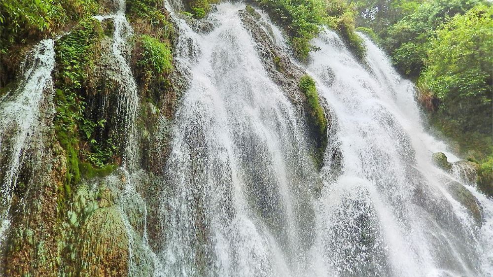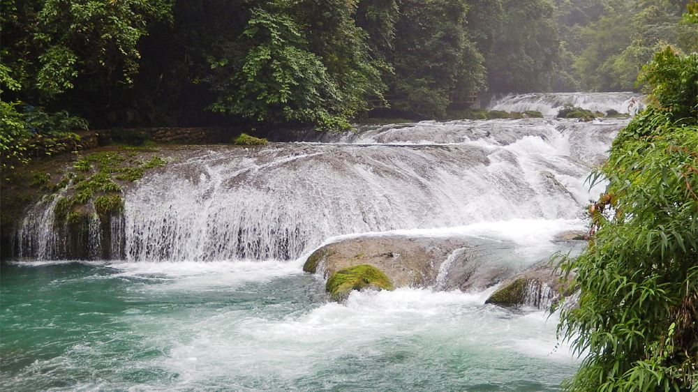 荔波小七孔景区全长13公里,平均宽度约1公里。由景区西门进入,第一个景点是卧龙潭瀑布。